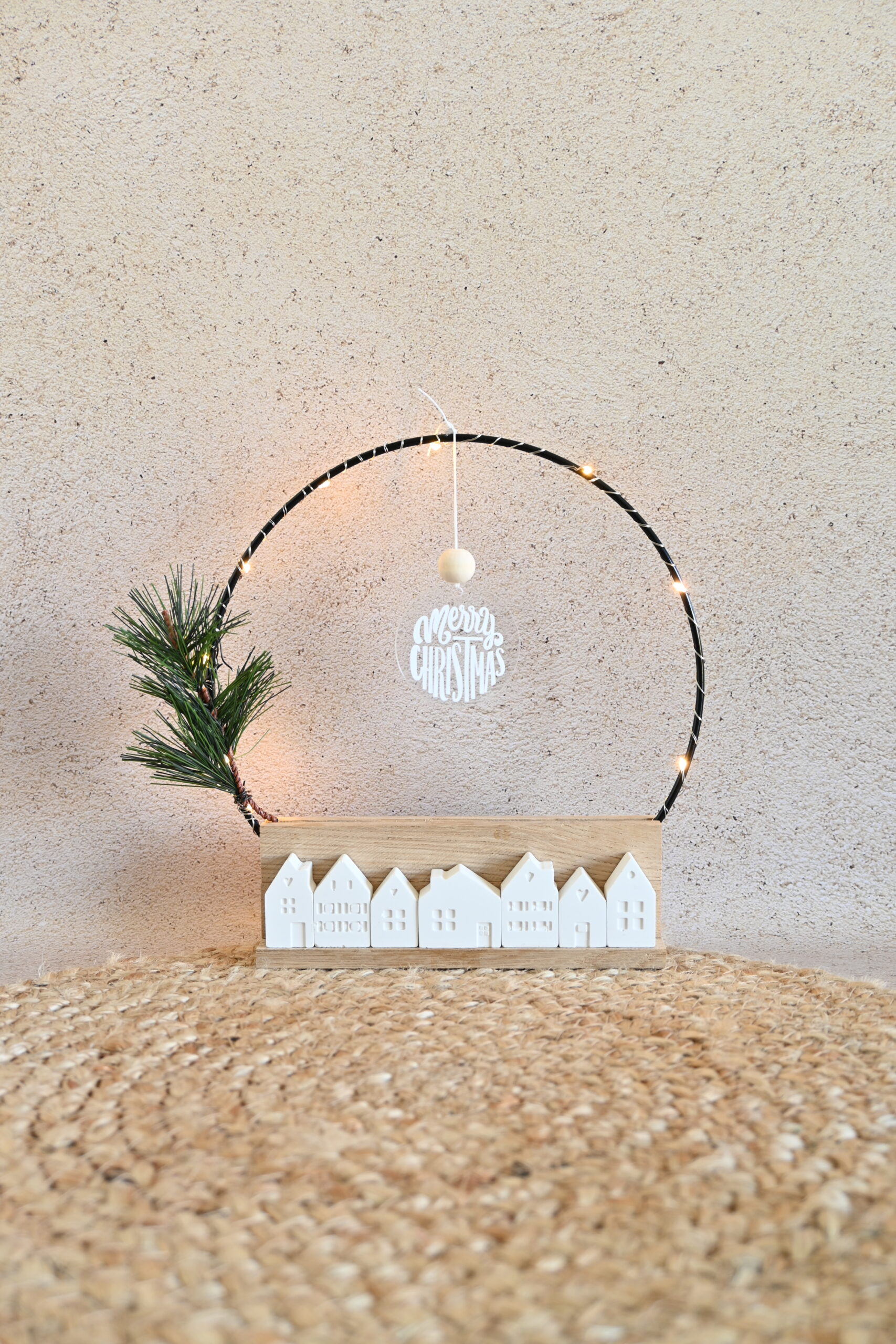 Een sfeervolle kerstboog met huisjes en lampjes ✨. Een betoverend kerstdecor dat je interieur laat fonkelen met warmte, licht en kerstmagie.