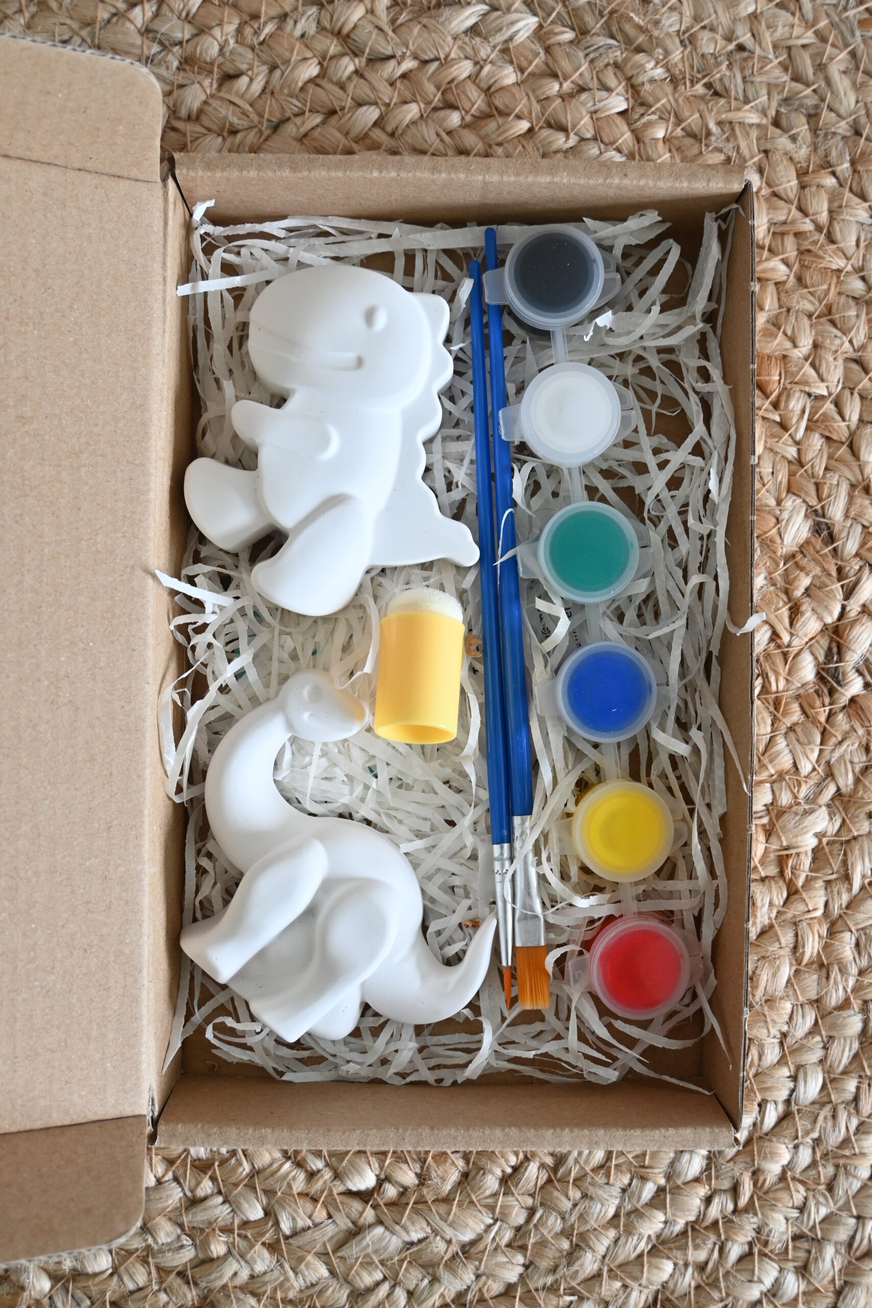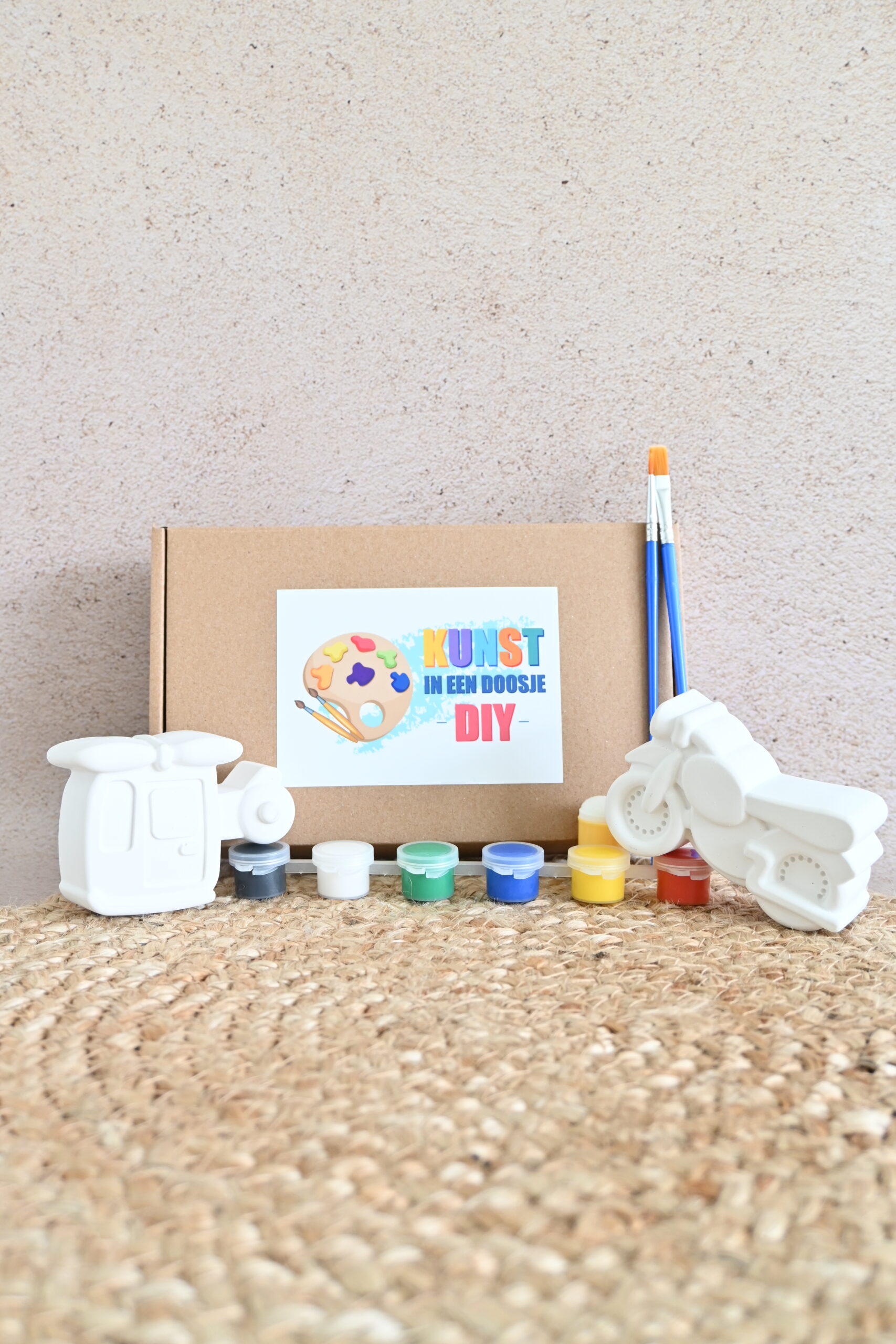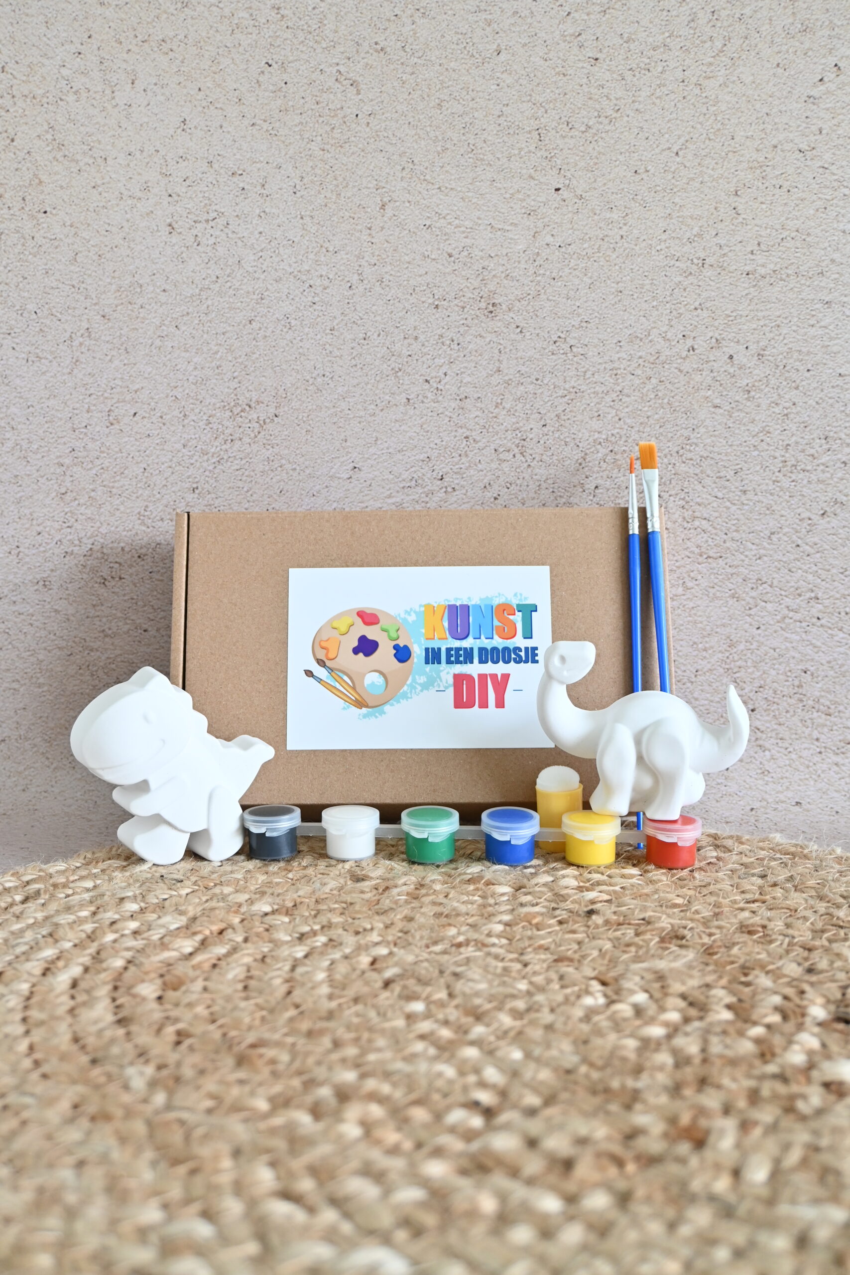 Inclusief twee figuurtjes, verfpotjes, twee penselen en vingersponsje