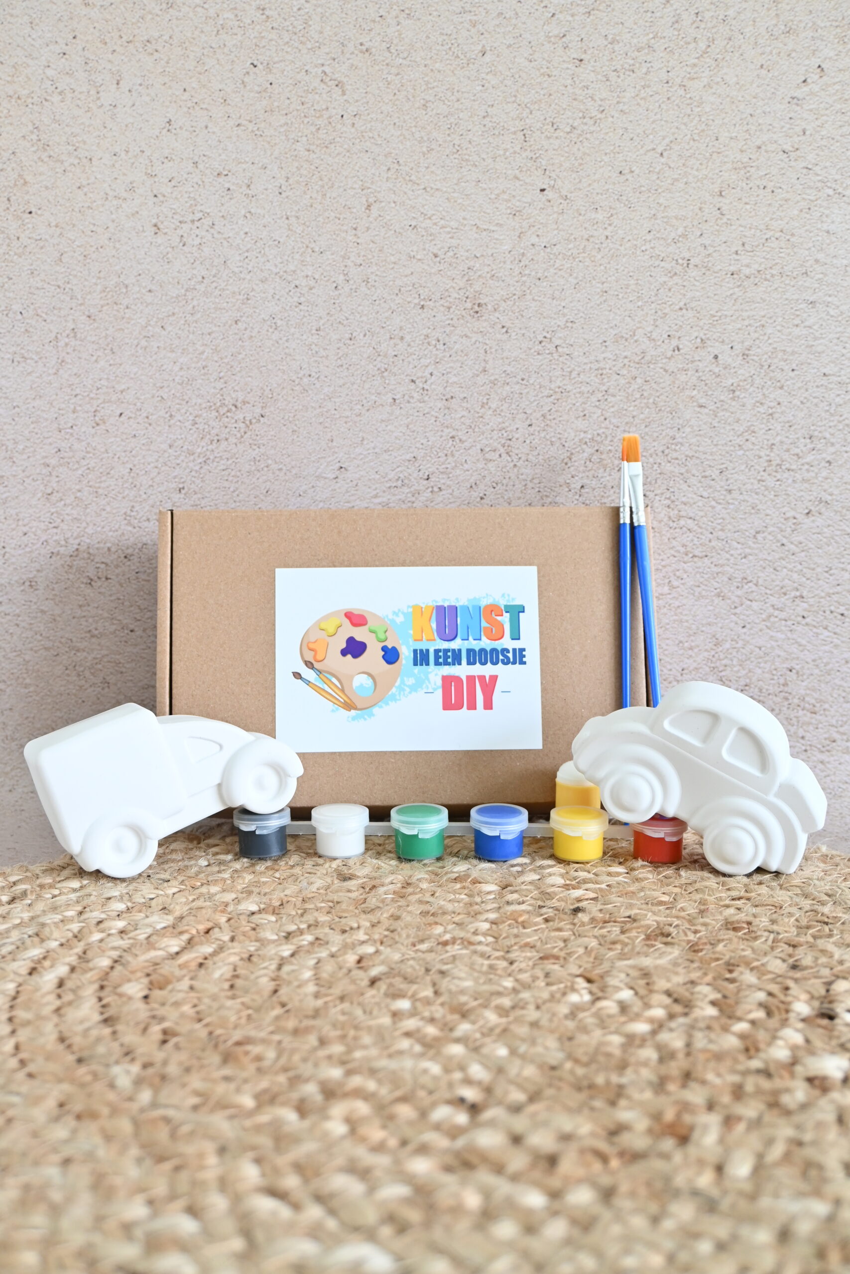 Twee stoere figuren om zelf te schilderen 🚗🦖. Kies voor snelle auto’s of machtige dino’s en maak er een kleurrijk kunstwerk van!